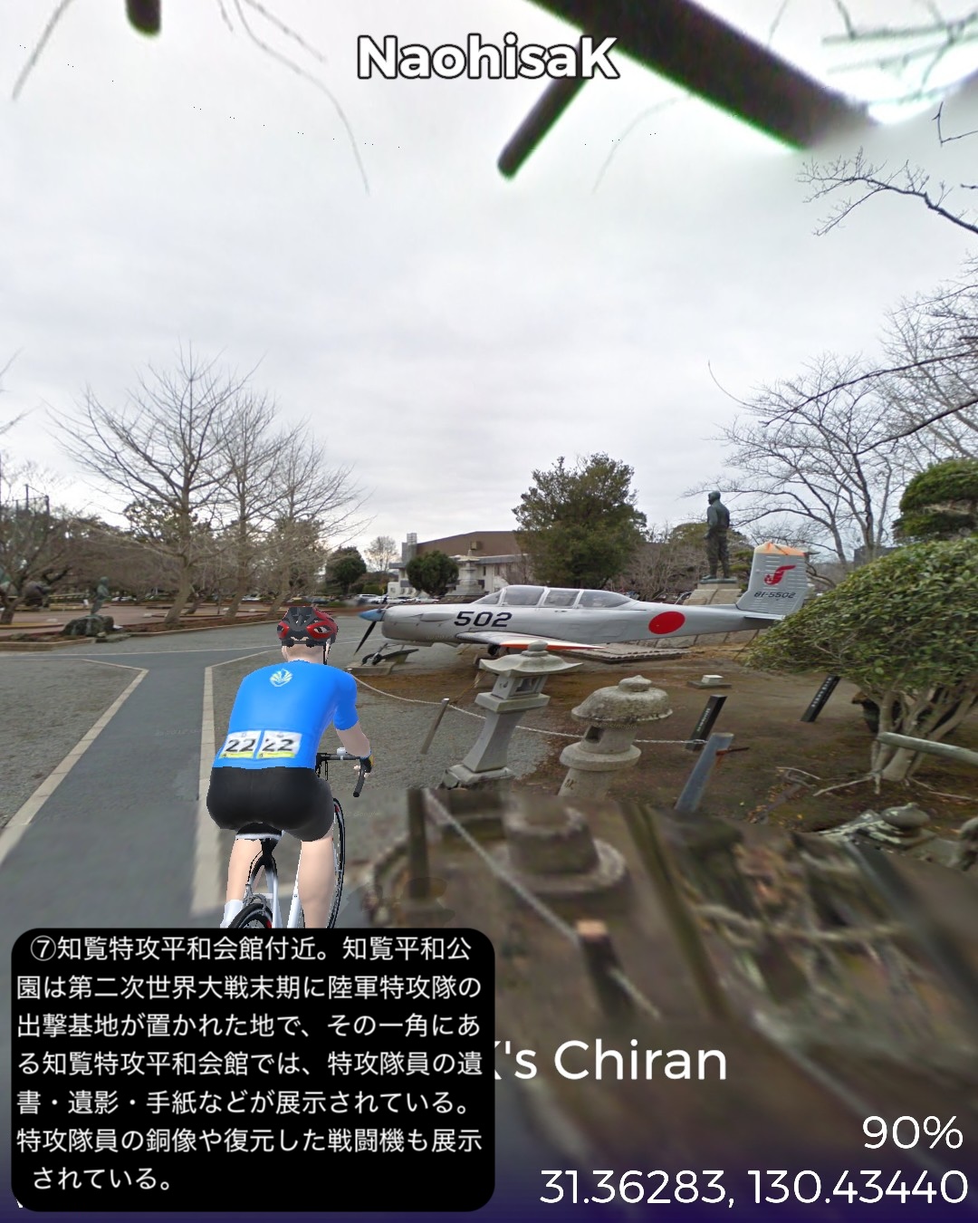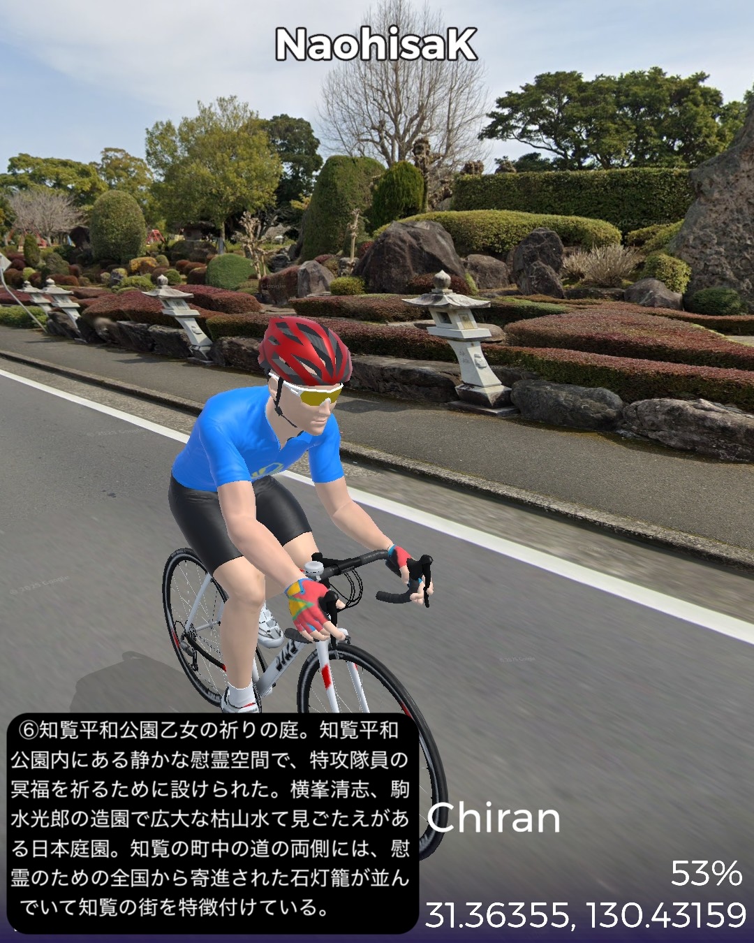 VRサイクリング 薩摩半島南西端から内陸を通って鹿児島市街へ戻る。野間岬のある漁港野間池を出発し、しばらく前回から続く薩摩半島南西部の複雑で風光明媚な海岸線に沿って進むと急に広大な平地が広がり、海岸も日本有数の長い砂浜である吹上浜となる。ここから東南東の内陸方面に進み加世田の市街を通り抜け緩やかな丘陵地を進んでゆくと武家屋敷と特攻隊慰霊の町知覧に入る。ここを一巡りした後、北北東に進路を取り、結構険しい山道を進み鹿児島市街に至る。鹿児島港の種子島・屋久島フェリーターミナルをゴールとする89kmの行程。ハイライトは2箇所。1箇所はスタート地点の野間池漁港から加世田付近までの海岸地帯。前回からの延長で秘境感溢れる風土だ。断崖と入り組んだ海岸線に小島と岩礁、こうした地形的要素がダイナミックな海岸美を構成するが、それだけでなく海に面した急斜面に形成された石積みの笠沙谷山段々畑や、石垣で囲まれた家並と迷路のような石畳の道が印象的な大当石垣群の里などと台風に晒される険しい地形の地に生きてきた人々の文化が感じられる道筋であった。もう1箇所は知覧。ここも以前からどんな所か興味があった町だ。いわゆる城下町とは異なり、薩摩藩の分散統治により作られた武家集落として位置付けられ、他の城下町によくある武家屋敷街とは規模とテイストの違う唯一無二な武家屋敷街となっている。折れ曲がった長い本馬場通りに沿って連なる石垣と生垣が織りなす景観は壮観。しかもその内側には単に建物としての屋敷があるだけでなく国の名勝に選ばれた7つもの庭園が連なっているのだ。庭園群は垣間見ることも叶わなかったがいずれ鹿児島方面を訪れた時には是非立ち寄りたいスポットだ。それから昭和の太平洋戦争の頃、ここにあった知覧特攻基地から1000名以上もの若い特攻隊員が飛び立ち帰らぬ人となっているのだ。この基地の跡地が彼らの慰霊の場所となり、また悲劇を後世に伝える資料館なども整備されている。また知覧の町全体の道路沿いに全国から寄進された数千もの石灯籠が立ち並ぶ様は慰霊の町知覧を特徴付ける景観となっている。さて次回からはしばらく鹿児島からフェリーで渡り、南西諸島から再度の沖縄まで島伝いに巡ってゆく予定。