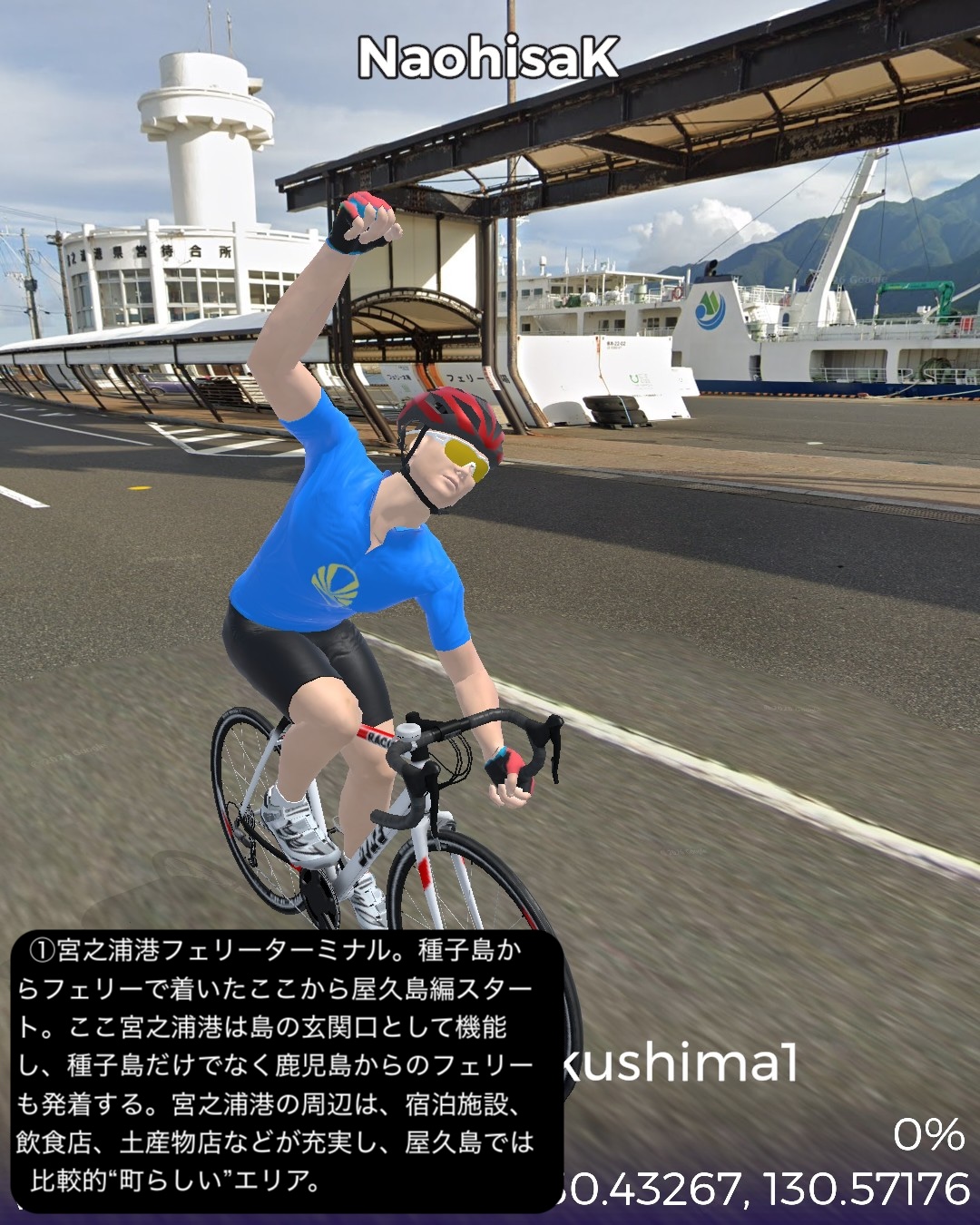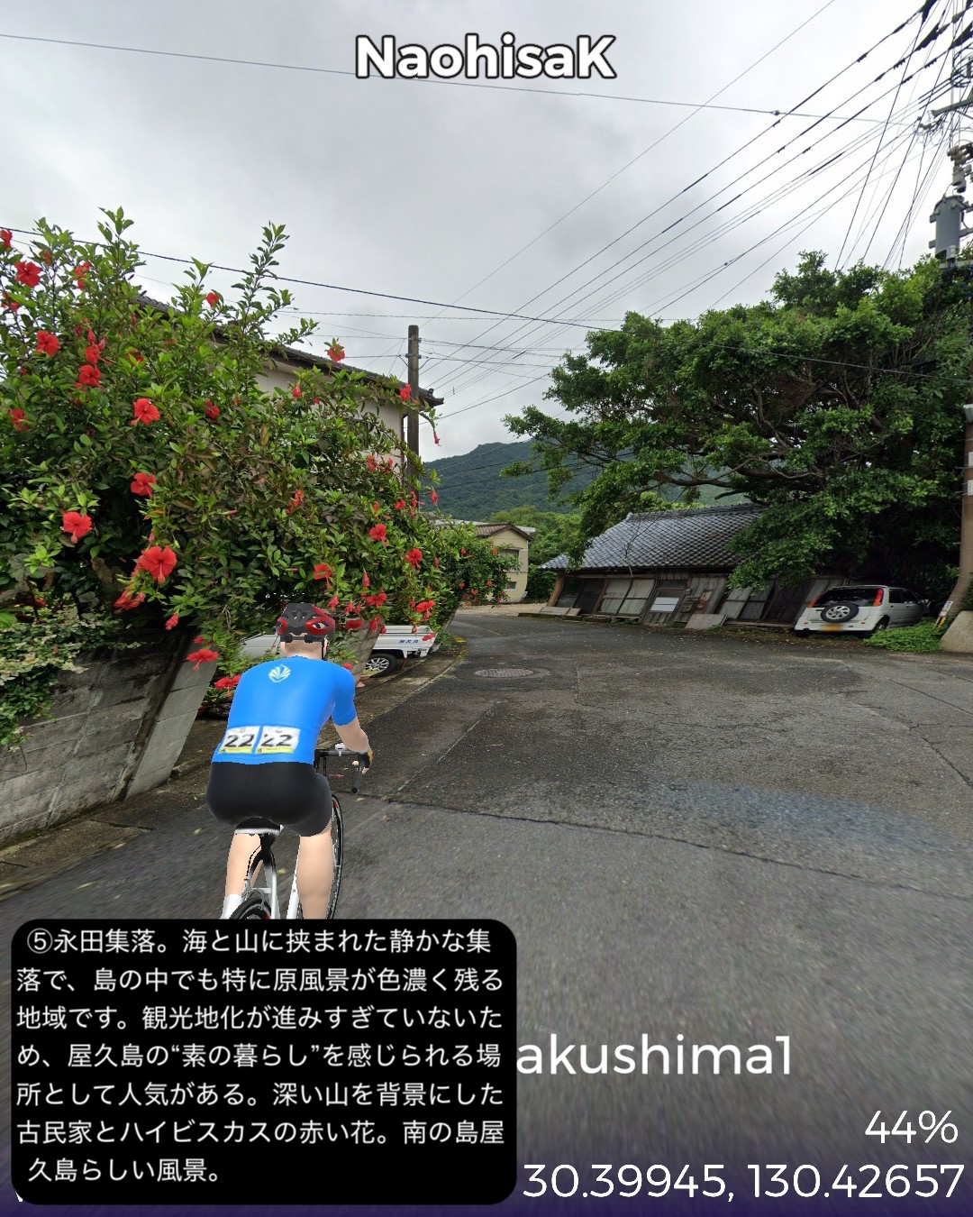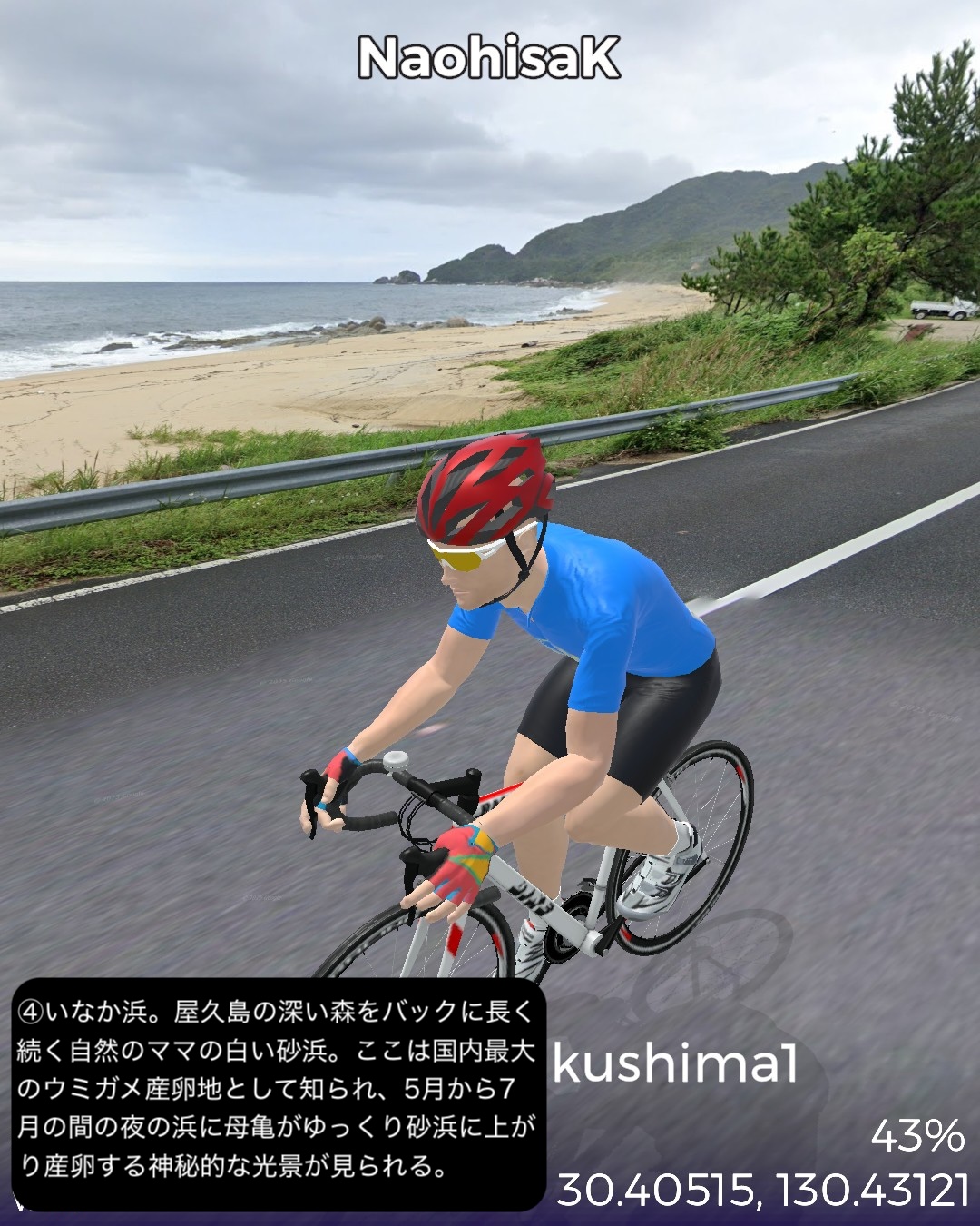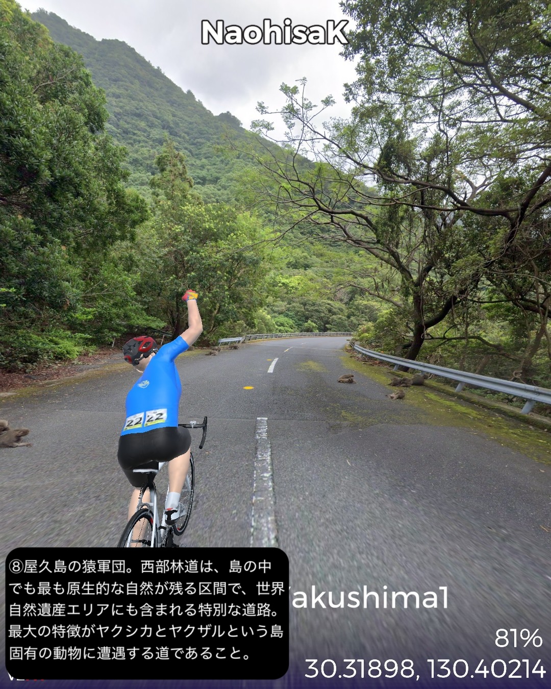 VRサイクリング 世界遺産の島、屋久島を巡る旅1日目。緑の回廊と称される島の周回道路に沿って走る。前回ゴールの種子島の島間港からのフェリーで到着した屋久島の北東部の玄関口宮之浦港をスタートし、宮之浦の町を一巡りした後、丸い島の沿岸に沿って反時計回りに進む。リアス式海岸というほど複雑ではないが、入江と岬を繰り返す海岸線。入江には漁港と漁村の集落。岬では眺めの良い展望所もあった。島の北から北西まで進むとウミガメの産卵日本一の美しいビーチ永田いなか浜を過ぎて永田集落。ここから先は西部林道として知られる原始の自然が息づくワイルドな道が続く。今回のゴール間近の島南西部の栗生集落まで一切人家というものがない。栗生集落の先にある中間ガジュマルとして知られる日本最大級のガジュマルの木のある中間集落をゴールとする52kmの行程。前半は美しいビーチや海を望む眺めの良い展望所はあるものの特に屋久島らしさを感じることはなかったが、後半の西部林道はまさにこれが世界遺産に値する自然環境だと唸らせるものがあった。まずとにかく左手の内陸部に広がる緑が深くて濃い。そして人が足を踏み入れていないであろう純粋な大自然の佇まい。野生動物の宝庫でもあるようで、林道のあちこちで、屋久島固有種、ヤクザルの群れがたむろしているのを見かけた。今回は遭遇しなかったが、同じく固有種のヤクシカも林道によく現れるらしい。時折開ける絶壁の上からの海の眺望もなかなかのものだ。特に屋久島の北西側の間近に浮かぶ口永良部島。2015年の大噴火で全島避難となったニュースは記憶に新しい。すでに警戒レベルは引き下げられており、見た目も特に噴煙などは見られない。しかしかなり近いので、噴火時は屋久島にも大迫力で観測されたことは想像できる。さて次回はこの流れで島の東側まで海沿いを進んだ後、内陸の奥深い山地へ進んでみる。
