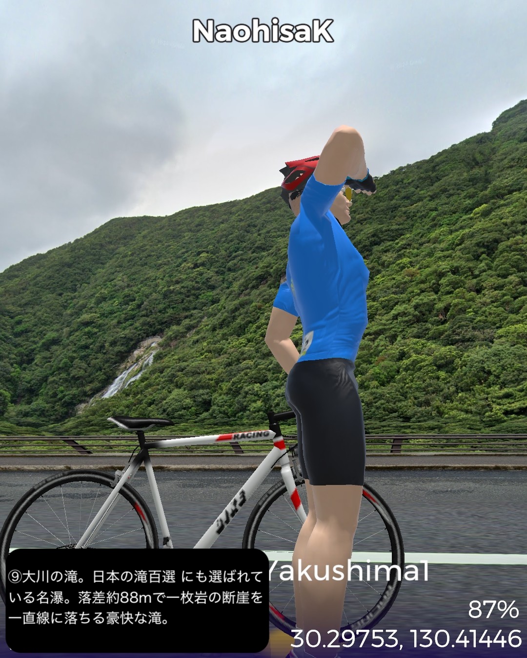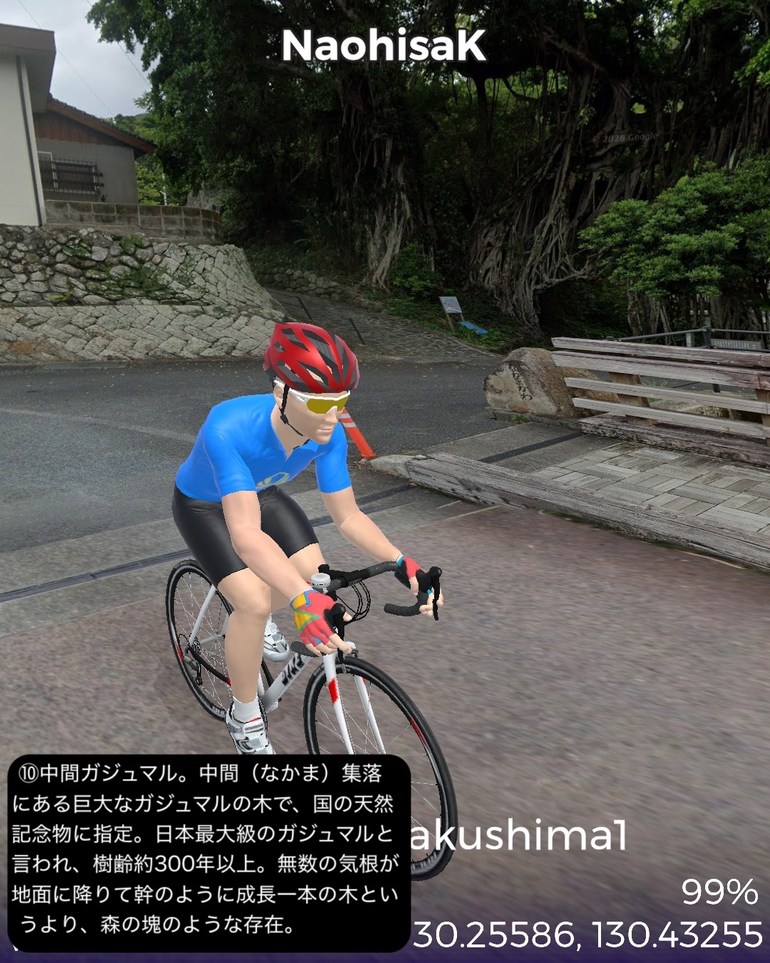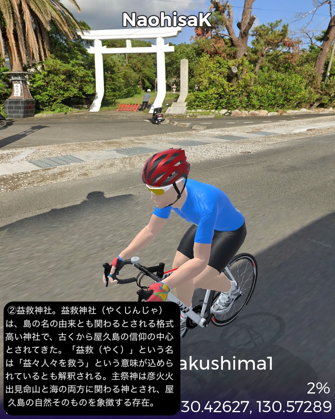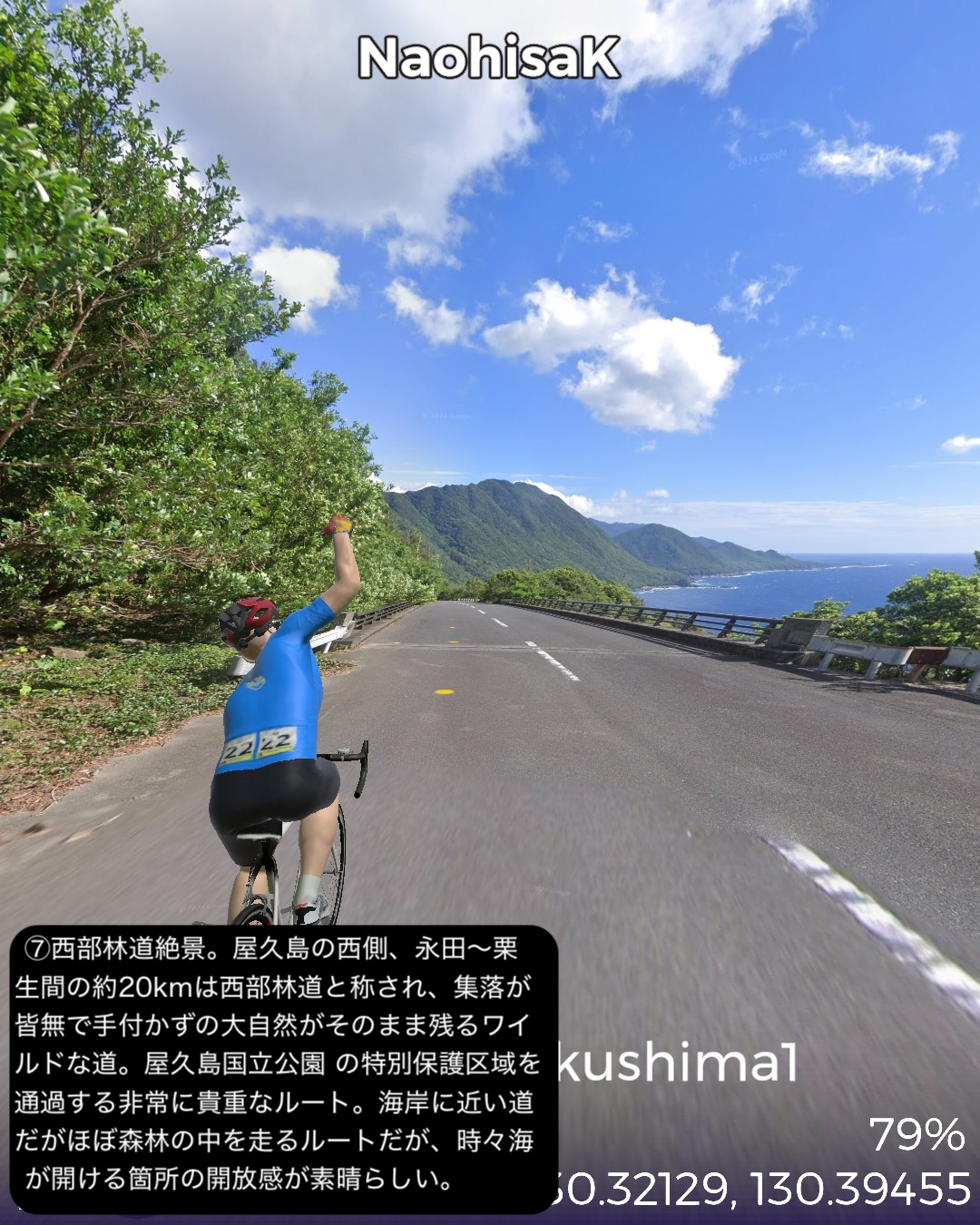 VRサイクリング 世界遺産の島、屋久島を巡る旅1日目。緑の回廊と称される島の周回道路に沿って走る。前回ゴールの種子島の島間港からのフェリーで到着した屋久島の北東部の玄関口宮之浦港をスタートし、宮之浦の町を一巡りした後、丸い島の沿岸に沿って反時計回りに進む。リアス式海岸というほど複雑ではないが、入江と岬を繰り返す海岸線。入江には漁港と漁村の集落。岬では眺めの良い展望所もあった。島の北から北西まで進むとウミガメの産卵日本一の美しいビーチ永田いなか浜を過ぎて永田集落。ここから先は西部林道として知られる原始の自然が息づくワイルドな道が続く。今回のゴール間近の島南西部の栗生集落まで一切人家というものがない。栗生集落の先にある中間ガジュマルとして知られる日本最大級のガジュマルの木のある中間集落をゴールとする52kmの行程。前半は美しいビーチや海を望む眺めの良い展望所はあるものの特に屋久島らしさを感じることはなかったが、後半の西部林道はまさにこれが世界遺産に値する自然環境だと唸らせるものがあった。まずとにかく左手の内陸部に広がる緑が深くて濃い。そして人が足を踏み入れていないであろう純粋な大自然の佇まい。野生動物の宝庫でもあるようで、林道のあちこちで、屋久島固有種、ヤクザルの群れがたむろしているのを見かけた。今回は遭遇しなかったが、同じく固有種のヤクシカも林道によく現れるらしい。時折開ける絶壁の上からの海の眺望もなかなかのものだ。特に屋久島の北西側の間近に浮かぶ口永良部島。2015年の大噴火で全島避難となったニュースは記憶に新しい。すでに警戒レベルは引き下げられており、見た目も特に噴煙などは見られない。しかしかなり近いので、噴火時は屋久島にも大迫力で観測されたことは想像できる。さて次回はこの流れで島の東側まで海沿いを進んだ後、内陸の奥深い山地へ進んでみる。