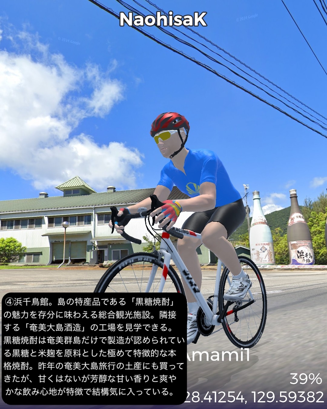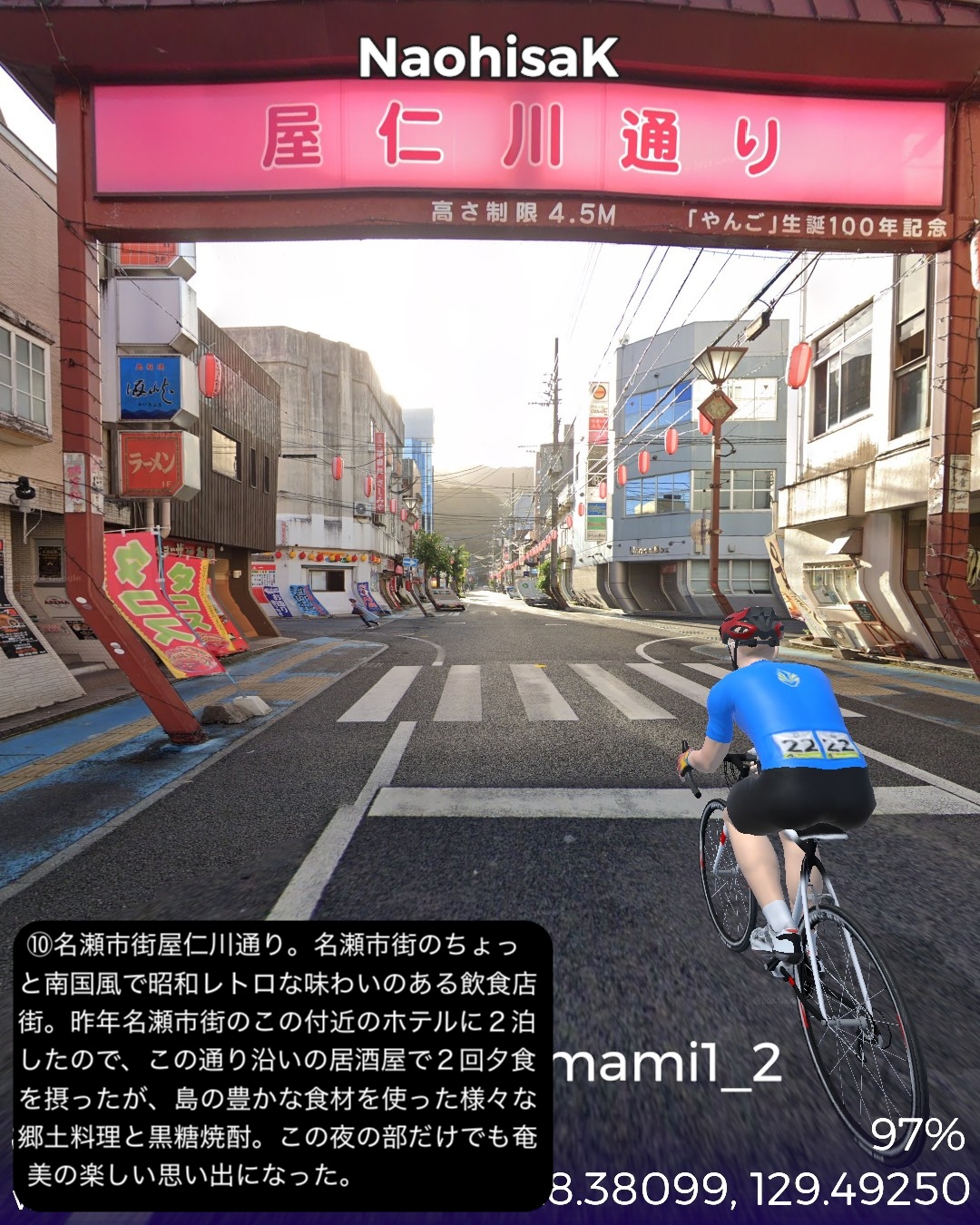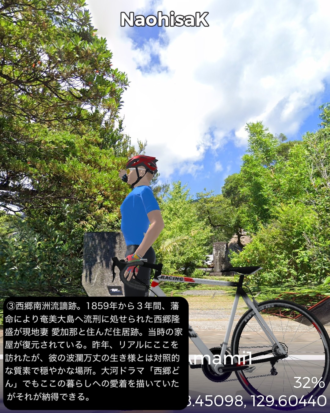 VRサイクリング 奄美大島の北東部を一巡りの巻。前回屋久島から鹿児島港経由でたどり着いた奄美大島の玄関口名瀬港のフェリーターミナルを出発し、島の北東部をほぼ海岸線に沿って時計回りに巡る。秋名集落、かがんばなの夕日展望所、安木屋場のソテツ群落を愛でつつ今井崎を廻ると、西郷隆盛が3年間流刑生活を送った西郷南洲流謫跡を通り龍郷町から笠利町へ入り笠利半島を横断してあやまる岬へ辿り着く。ここからは島の東から南の海岸線に沿って、奄美空港、奄美パークを通り過ぎ、白砂とエメラルドグリーンのビーチが続くリゾート地帯を進む。奄美大島紬村から海岸沿いの山の上の道に入り、2つの海が見える丘の眺望をめでた後、海岸沿いの山の上の道を進んで島の中部に下る。ここからは島を縦断する国道で島の内陸を横切って名瀬市街へ戻る。名瀬市街の中心部を巡って奄美大島の総鎮守となっている高千穂神社をゴールとする96kmの行程。このルートは実に馴染み深く、昨年3月にリアルに奄美大島を旅行した際にレンタカーで走り回った道が今回の全行程の2/3程度を占めている。写真に収めたスポットもほぼ全てリアルに立ち寄った場所ばかり。こんなルート構成は在住の東京近辺を除くとVRサイクリングのルートとしては非常にレアだと言っていい。VRで走行しながらもリアルな再訪感に包まれていた。特に今回の島の北東部はリアルにも結構丹念に巡ったのでそういう感覚になるのだろう。奄美大島の魅力は南国のリゾートというロケーションでありながら土着な独自文化のあれこれが味わえる点にある。黒糖に黒糖焼酎、大島紬、鶏飯(けいはん)や島豆腐などの郷土料理。沖縄とも九州とも異なるテイストが感じられるのだ。沖縄ほどにリゾート開発が進んでいないのもいい。名瀬のレトロな酒場横丁で美味しい郷土料理を肴に黒糖焼酎を一杯やる夜の部も楽しい。だんだんVRサイクリングを離れてリアルな旅行話になってきたが、今回のルートを走行しながらそうしたリアルな旅が思い出されてきたわけである。
