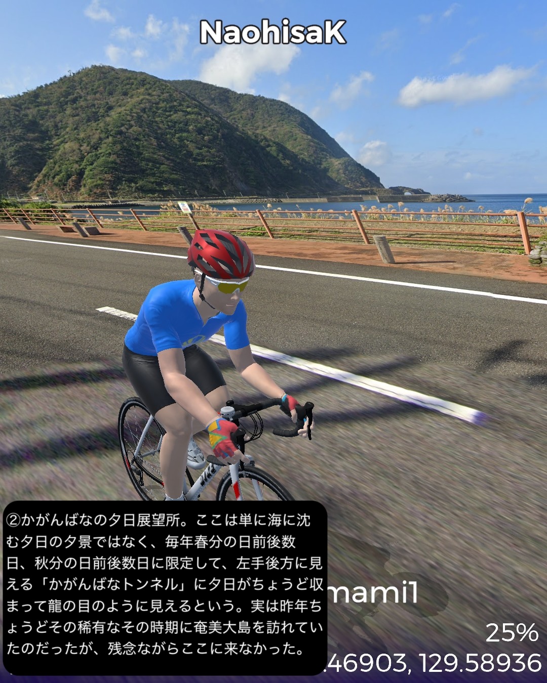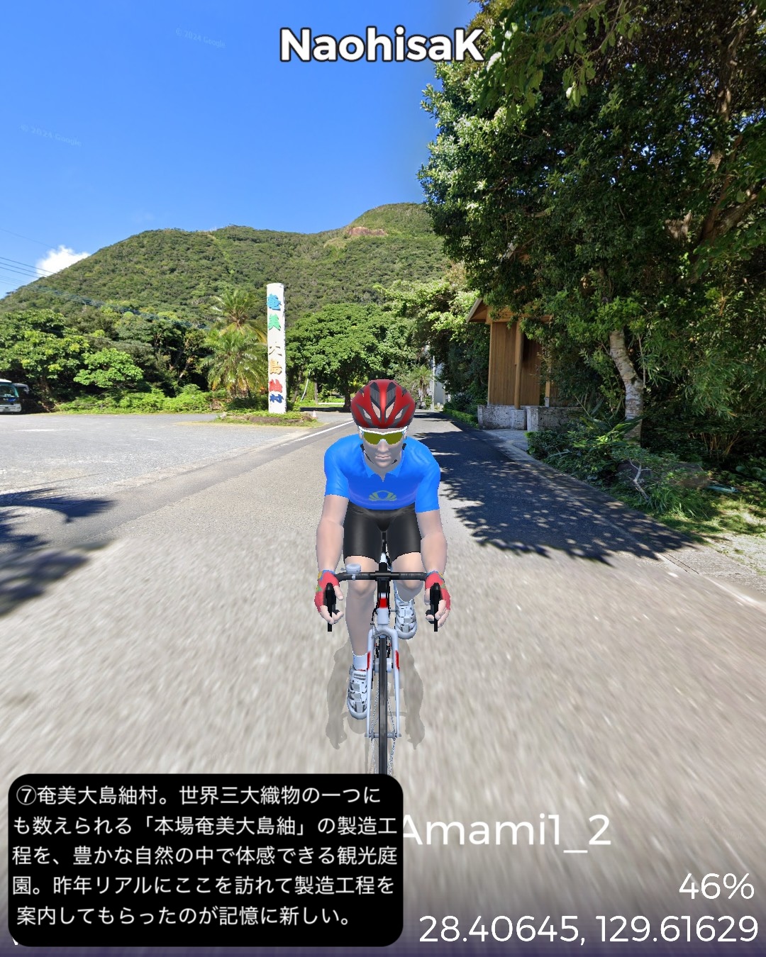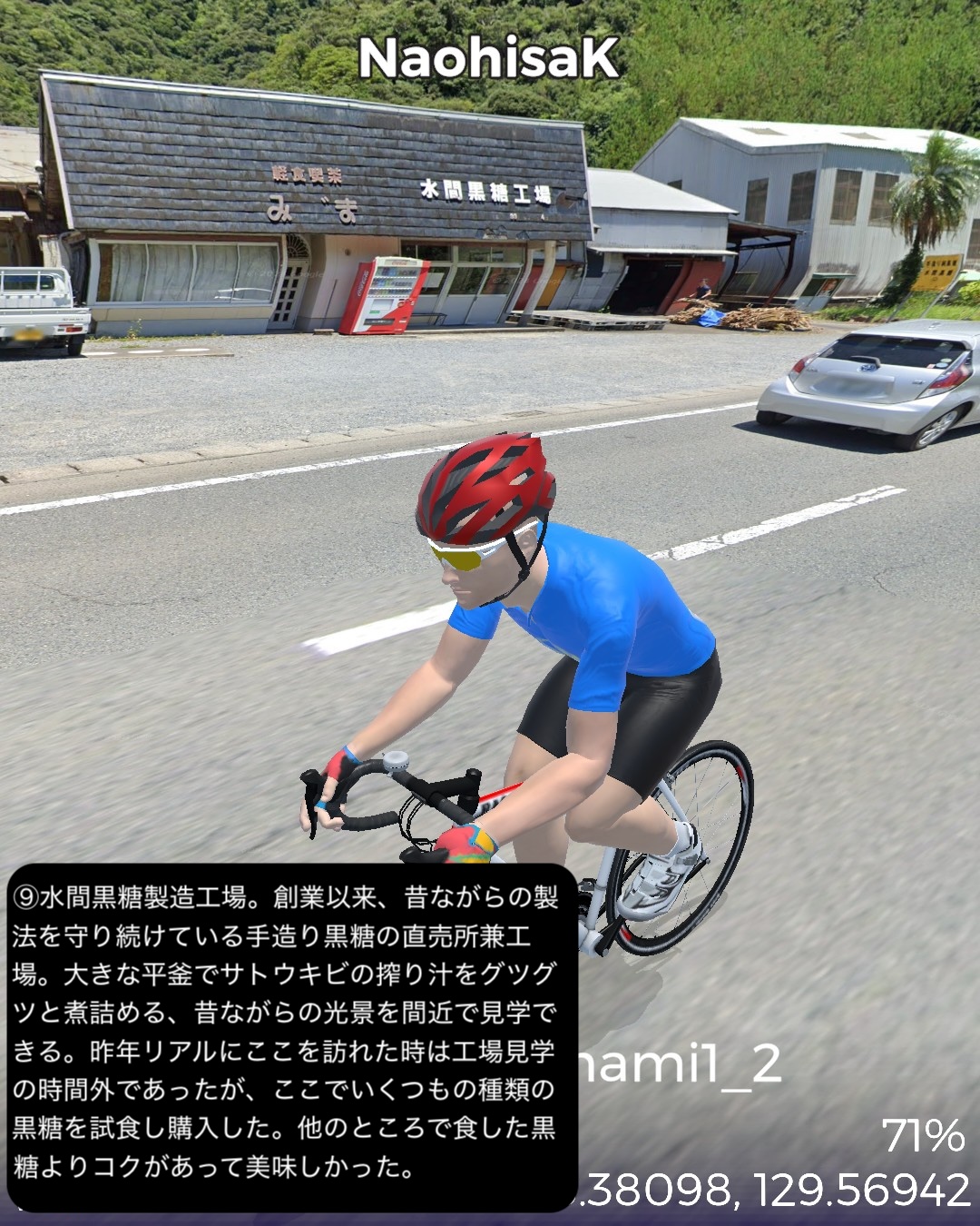VRサイクリング 奄美大島の北東部を一巡りの巻。前回屋久島から鹿児島港経由でたどり着いた奄美大島の玄関口名瀬港のフェリーターミナルを出発し、島の北東部をほぼ海岸線に沿って時計回りに巡る。秋名集落、かがんばなの夕日展望所、安木屋場のソテツ群落を愛でつつ今井崎を廻ると、西郷隆盛が3年間流刑生活を送った西郷南洲流謫跡を通り龍郷町から笠利町へ入り笠利半島を横断してあやまる岬へ辿り着く。ここからは島の東から南の海岸線に沿って、奄美空港、奄美パークを通り過ぎ、白砂とエメラルドグリーンのビーチが続くリゾート地帯を進む。奄美大島紬村から海岸沿いの山の上の道に入り、2つの海が見える丘の眺望をめでた後、海岸沿いの山の上の道を進んで島の中部に下る。ここからは島を縦断する国道で島の内陸を横切って名瀬市街へ戻る。名瀬市街の中心部を巡って奄美大島の総鎮守となっている高千穂神社をゴールとする96kmの行程。このルートは実に馴染み深く、昨年3月にリアルに奄美大島を旅行した際にレンタカーで走り回った道が今回の全行程の2/3程度を占めている。写真に収めたスポットもほぼ全てリアルに立ち寄った場所ばかり。こんなルート構成は在住の東京近辺を除くとVRサイクリングのルートとしては非常にレアだと言っていい。VRで走行しながらもリアルな再訪感に包まれていた。特に今回の島の北東部はリアルにも結構丹念に巡ったのでそういう感覚になるのだろう。奄美大島の魅力は南国のリゾートというロケーションでありながら土着な独自文化のあれこれが味わえる点にある。黒糖に黒糖焼酎、大島紬、鶏飯(けいはん)や島豆腐などの郷土料理。沖縄とも九州とも異なるテイストが感じられるのだ。沖縄ほどにリゾート開発が進んでいないのもいい。名瀬のレトロな酒場横丁で美味しい郷土料理を肴に黒糖焼酎を一杯やる夜の部も楽しい。だんだんVRサイクリングを離れてリアルな旅行話になってきたが、今回のルートを走行しながらそうしたリアルな旅が思い出されてきたわけである。