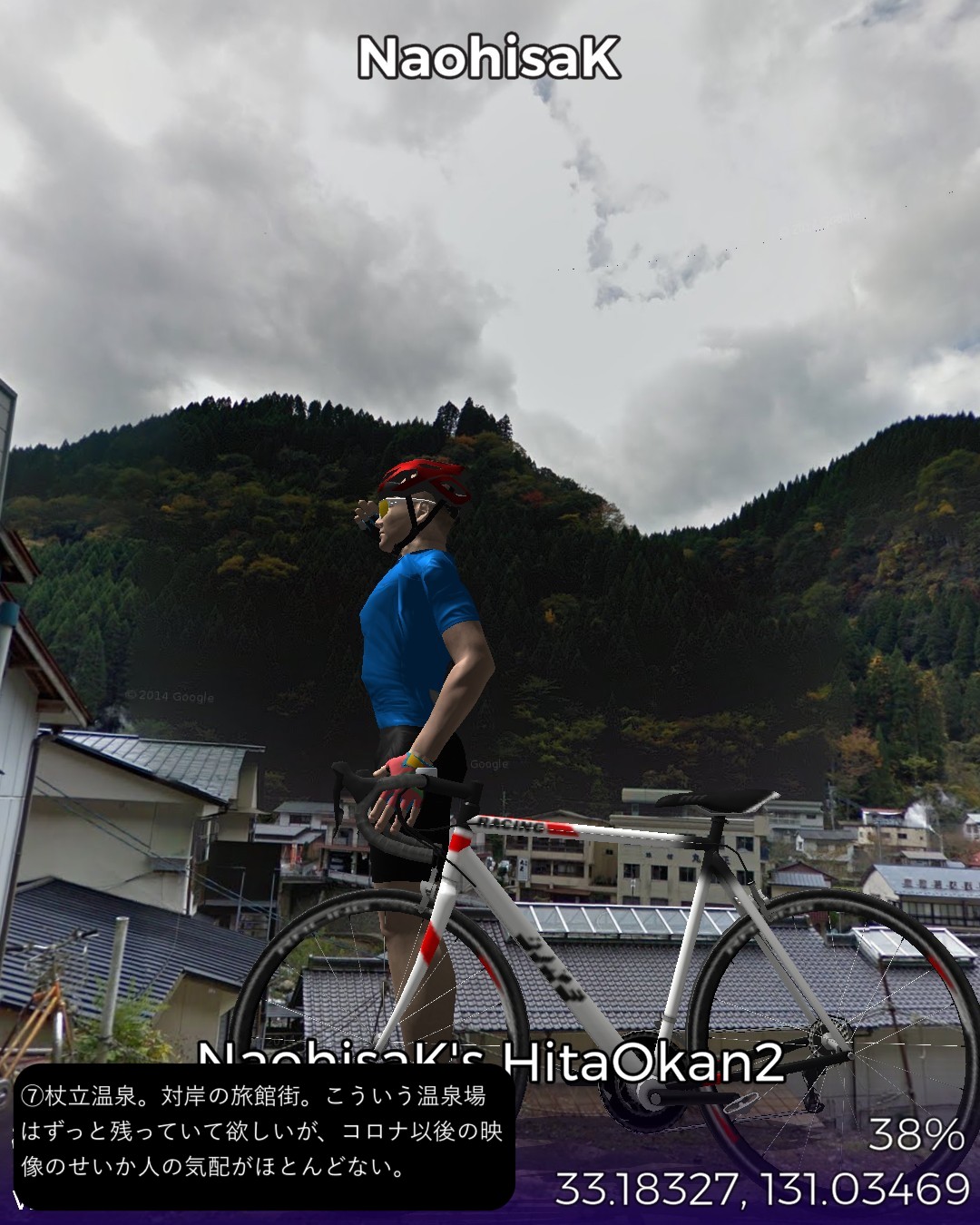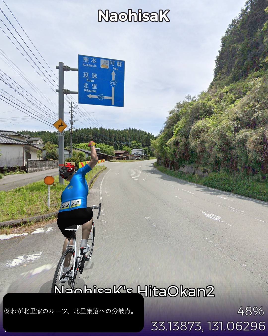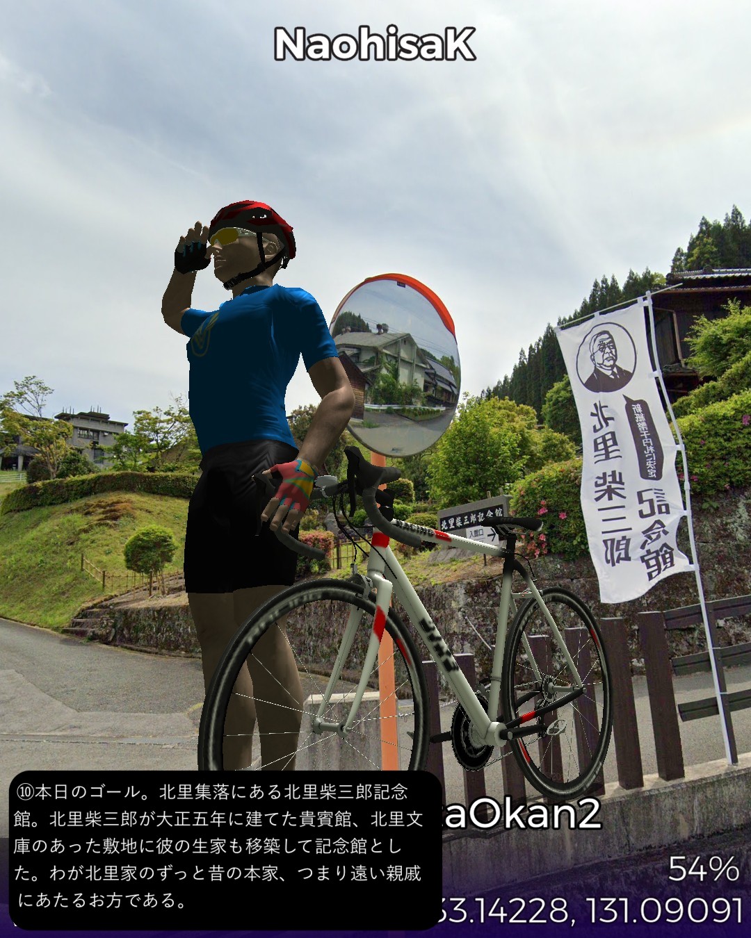 VRサイクリング日田往還2日目。幕府の天領として繁栄した日田から別の日田往還の街道に乗り換えて、阿蘇方面を目指す。本日は温泉場として有名な杖立宿を経由して小国町へ至る。本日のゴールとしては街道をちょっと外れて、小国町の外れに位置する北里集落とした。日田からずっと渓流沿いに山道を進んでゆくが、道沿いには温泉が数多く点在する。その中でも杖立宿の杖立温泉は大きな温泉地であるが、山間の湯治場の雰囲気が色濃く漂う素敵な場所だ。福岡に住んでいた子供の頃も親がこの温泉を好んでいて何回か訪れた記憶がある。ほとんど記憶は失せてはいるが、多分その頃とほぼ変わらないレトロな温泉街は何か記憶を刺激するものがあるのか懐かしい。さて本日のゴールとした北里集落は、北里柴三郎の出身地であるが、実は我が北里家、さらに日本中の北里姓のルーツの地でもある。わが北里家は北里柴三郎の本家筋と遠い昔に別れた分家らしい。私事で恐縮だが、末っ子の私の祖父が将来を悲観し、家出してこの集落に別れを告げ、島根の家出娘の祖母と一緒になって大阪に居を構え、父が生まれた。家出した夜、集落を取り巻く山の上から松明を焚いて自分を探す捜索隊を眺めていたという。何か映画のシーンのようだ。子供の頃には来た覚えはないが、30年ほど前に一度訪れたことがある。