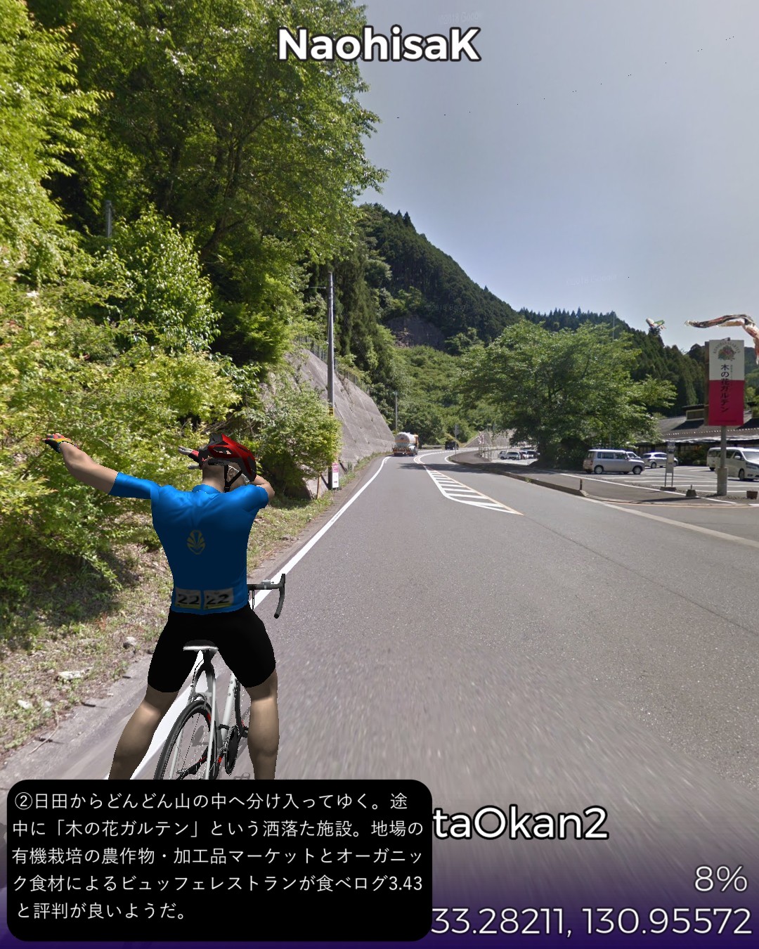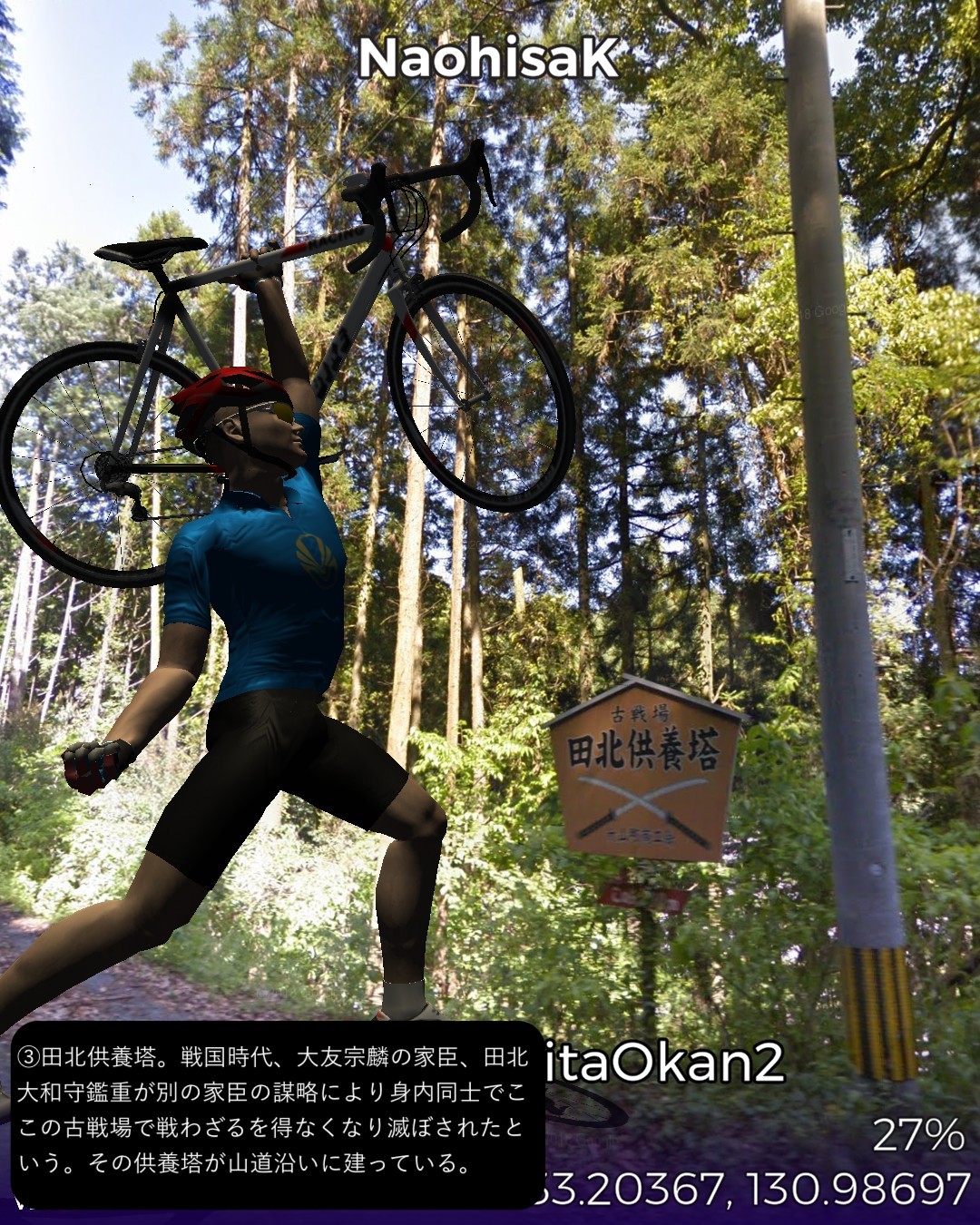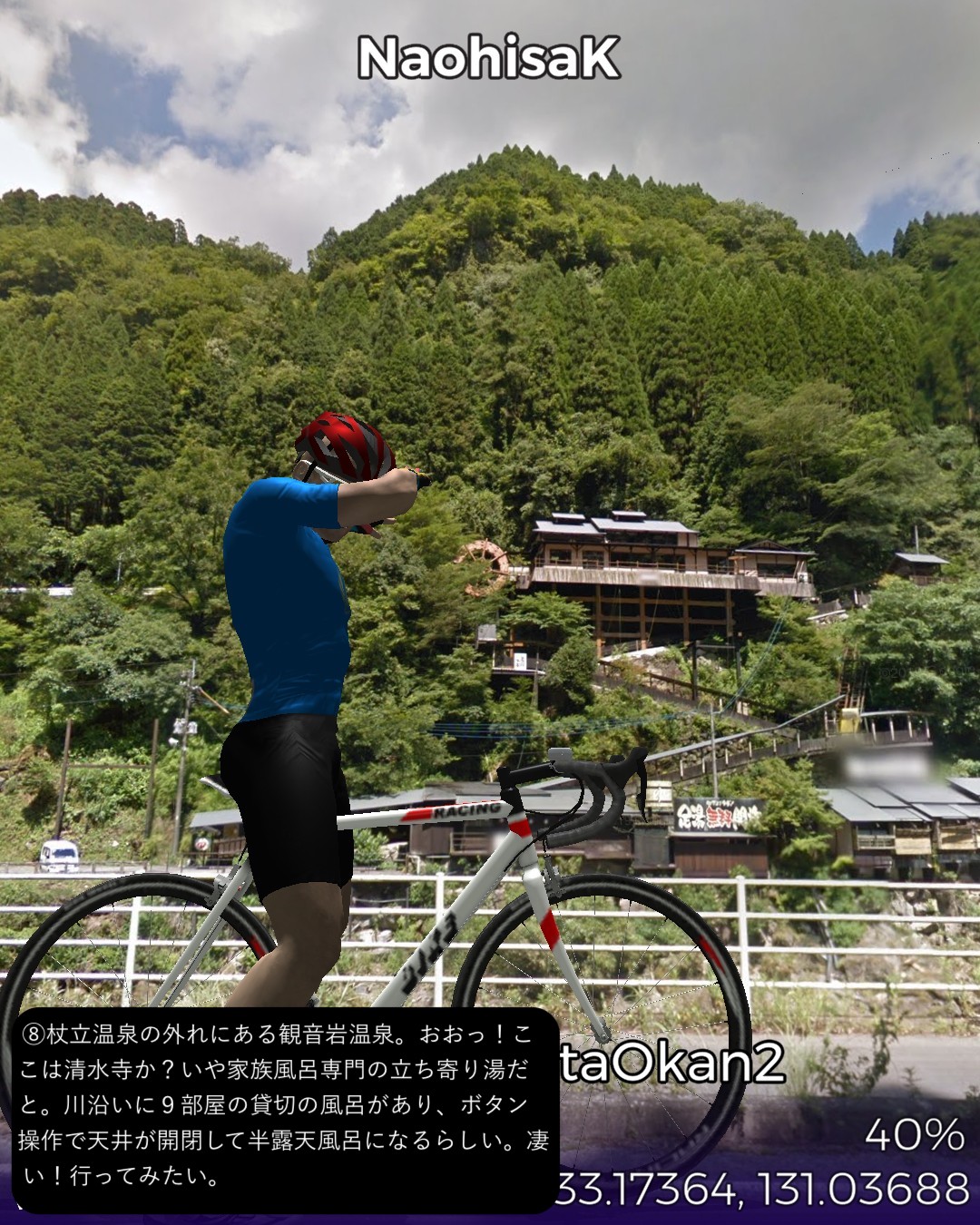 VRサイクリング日田往還2日目。幕府の天領として繁栄した日田から別の日田往還の街道に乗り換えて、阿蘇方面を目指す。本日は温泉場として有名な杖立宿を経由して小国町へ至る。本日のゴールとしては街道をちょっと外れて、小国町の外れに位置する北里集落とした。日田からずっと渓流沿いに山道を進んでゆくが、道沿いには温泉が数多く点在する。その中でも杖立宿の杖立温泉は大きな温泉地であるが、山間の湯治場の雰囲気が色濃く漂う素敵な場所だ。福岡に住んでいた子供の頃も親がこの温泉を好んでいて何回か訪れた記憶がある。ほとんど記憶は失せてはいるが、多分その頃とほぼ変わらないレトロな温泉街は何か記憶を刺激するものがあるのか懐かしい。さて本日のゴールとした北里集落は、北里柴三郎の出身地であるが、実は我が北里家、さらに日本中の北里姓のルーツの地でもある。わが北里家は北里柴三郎の本家筋と遠い昔に別れた分家らしい。私事で恐縮だが、末っ子の私の祖父が将来を悲観し、家出してこの集落に別れを告げ、島根の家出娘の祖母と一緒になって大阪に居を構え、父が生まれた。家出した夜、集落を取り巻く山の上から松明を焚いて自分を探す捜索隊を眺めていたという。何か映画のシーンのようだ。子供の頃には来た覚えはないが、30年ほど前に一度訪れたことがある。